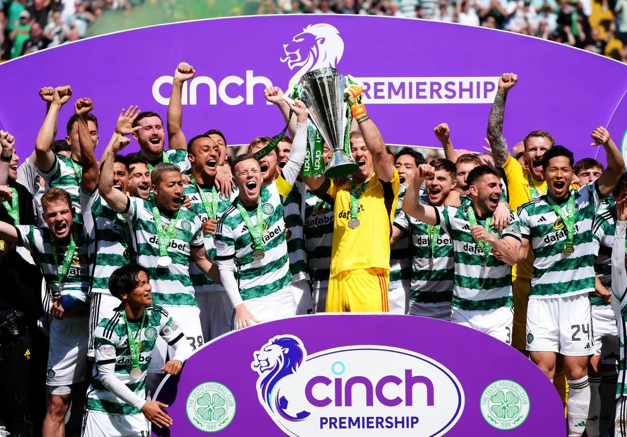 Celtic players lift the Premiership trophy